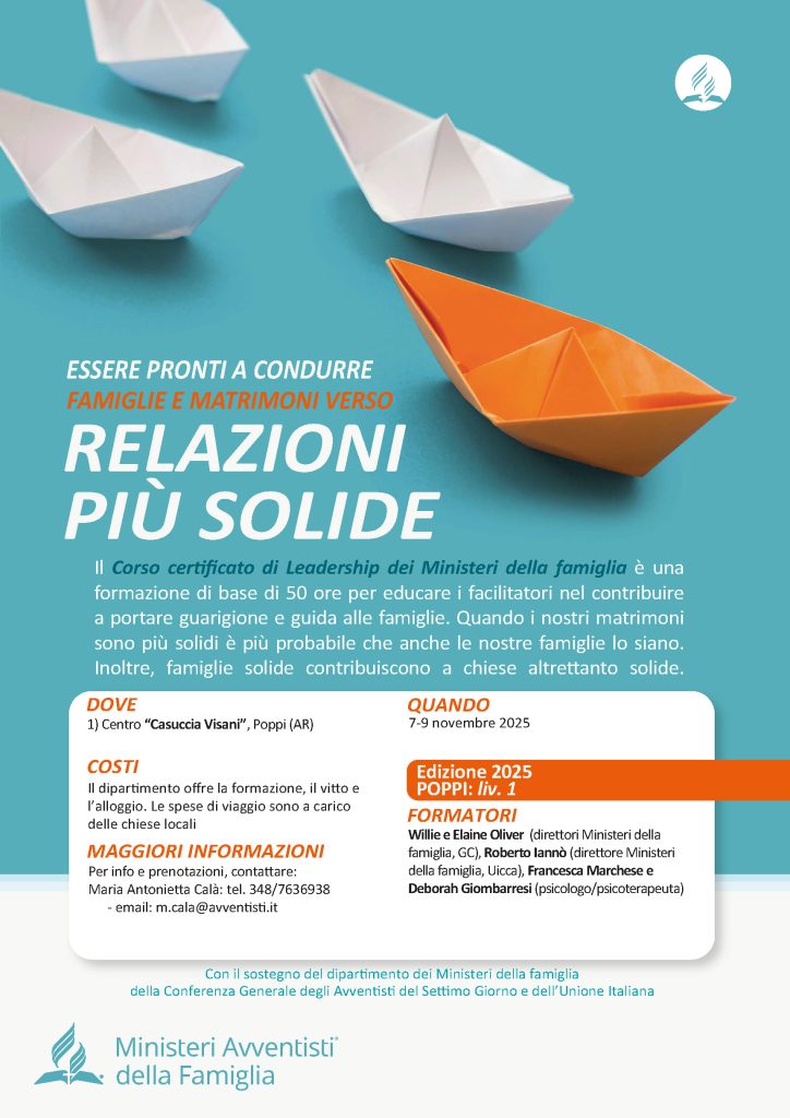 Continua il corso di formazione per direttori locali del Dipartimento Ministeri Avventisti della Famiglia (MAF). La data unica nazionale per il 2025 è dal 7 al 9 novembre, a Poppi, con i coniugi Willie e Elaine Oliver, responsabili dei MAF presso la Conferenza Generale (o Chiesa mondiale); con Roberto Iannò, direttore dei MAF per l’Unione [...] Leggi tutto
